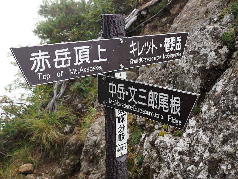 赤岳まで登ると富士山が見えるかと期待してたのですが、ガスがかかって、景色は真っ白でした。